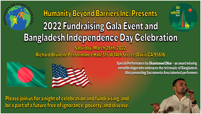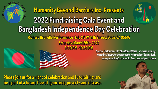 HBB 2022 Independence Day celebration and HBB’s annual fundraising gala event https://stage2.humanitybeyondbarriers.org/hbb-2022-independence-day-celebration-and-hbbs-annual-fundraising-gala-event/ https://stage2.humanitybeyondbarriers.org/hbb-2022-independence-day-celebration-and-hbbs-annual-fundraising-gala-event/#respond Fri, 04 Mar 2022 06:36:52 +0000 https://stage2.humanitybeyondbarriers.org/?p=3467 As the pandemic situation eases, we are excited to announce that HBB’s 2022 Annual Gala Event will be held in-person in a magnificent performing Hall in Davis, under a congenial indoor environment. We will be bringing back this highly rated community event with its tradition – celebration of Bangladesh Independence Day together and Giving Back to the community with the spirit of freedom. An extraordinary performance segment by the community participants will be followed by our celebrity guest artist. This year we are presenting Shantoneel Dhar, an award-winning and versatile singer (https://www.facebook.com/santoneel).